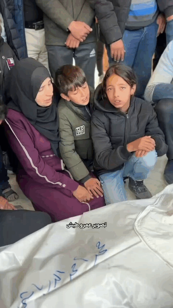 عائلة الشهيد محمد الدرباشي، مدير شرطة غرب خانيونس،تُلقي النظرة الأخيرة عليه، بعد أن استُهدف منزله فجر اليوم بغارة إسرائيلية.
