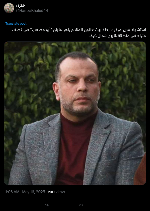 Beit Hanoun Police Station Director Lieutenant Colonel Zaher Alian "Abu Musab" was killed in an Israeli airstrike on his home in the Qalibo area, north of Gaza.