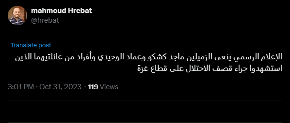 Official media mourns colleagues Majed Kashko and Imad Al-Wahidi and members of their families who were martyred as a result of the occupation's bombing of the Gaza Strip.