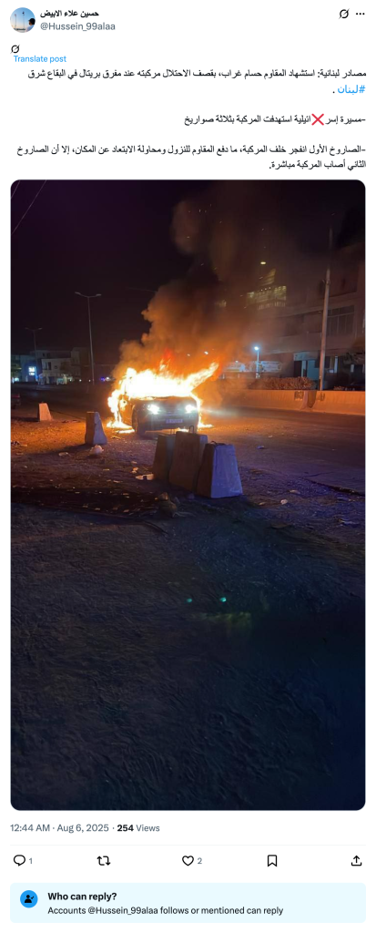 مصادر لبنانية: استشهاد المقاوم حسام غراب، بقصف الاحتلال مركبته عند مفرق بريتال في البقاع شرق #لبنان .