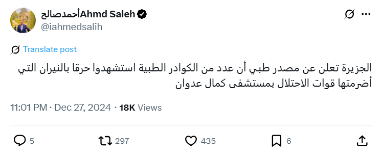 Al Jazeera reports, citing a medical source, that a number of medical personnel were burned to death in the fire set by the occupation forces at Kamal Adwan Hospital.