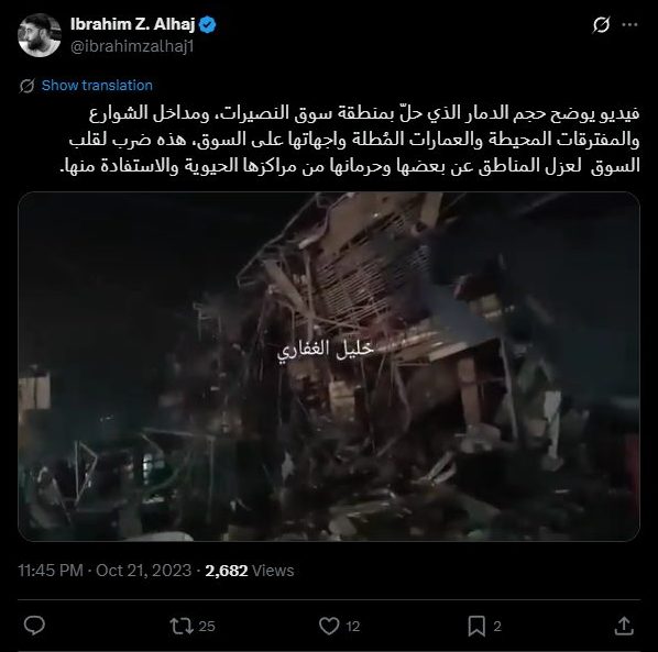 فيديو يوضح حجم الدمار الذي حلّ بمنطقة سوق النصيرات، ومداخل الشوارع والمفترقات المحيطة والعمارات المُطلة واجهاتها على السوق، هذه ضرب لقلب السوق لعزل المناطق عن بعضها وحرمانها من مراكزها الحيوية والاستفادة منها.