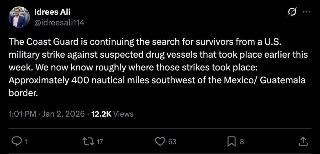 The Coast Guard is continuing the search for survivors from a U.S. military strike against suspected drug vessels that took place earlier this week. We now know roughly where those strikes took place: Approximately 400 nautical miles southwest of the Mexico/ Guatemala border.