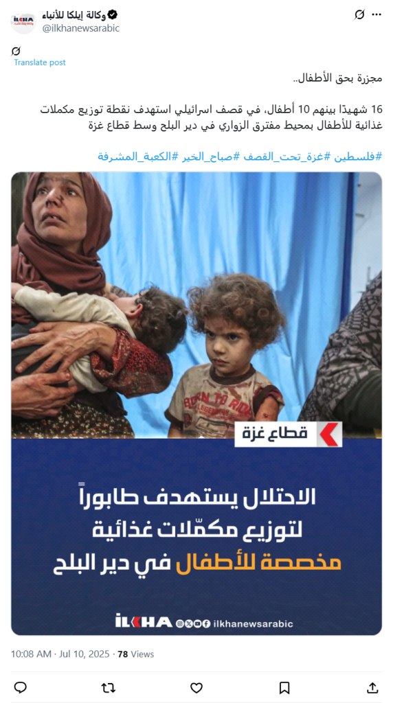 16 martyrs, including 10 children, in an Israeli bombardment targeting a food supplement distribution point for children near the Al-Zawari Junction in Deir al-Balah, central Gaza Strip.