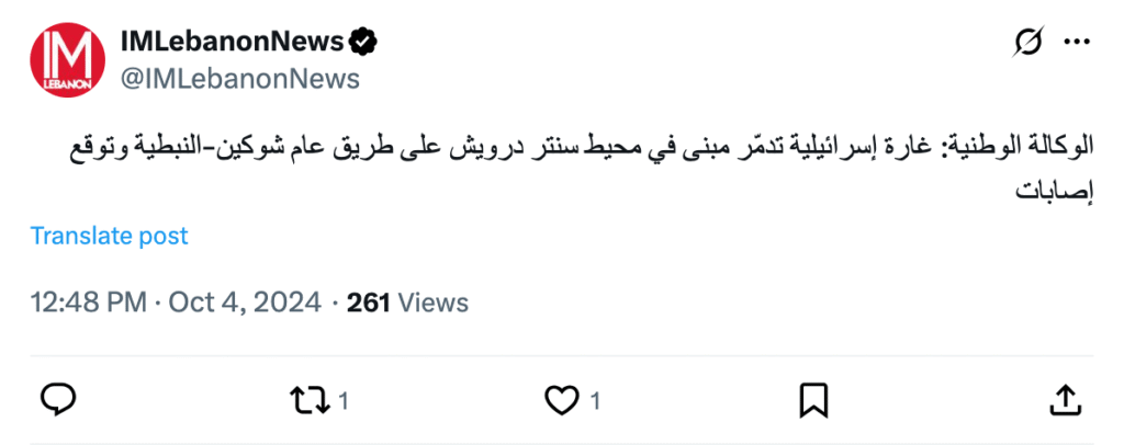 الوكالة الوطنية: غارة إسرائيلية تدمّر مبنى في محيط سنتر درويش على طريق عام شوكين-النبطية وتوقع إصابات