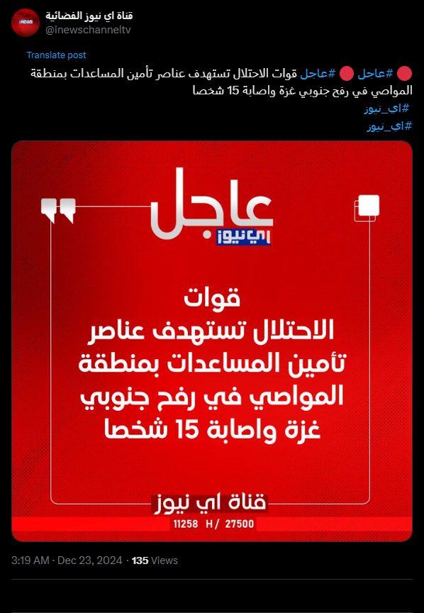 #Urgent #Urgent Occupation forces target aid workers in the Al-Mawasi area in Rafah, southern Gaza, wounding 15 people.