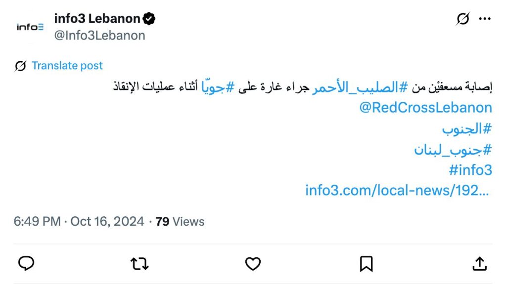 إصابة مسعفيْن من #الصليب_الأحمر جراء غارة على #جويّا أثناء عمليات الإنقاذ