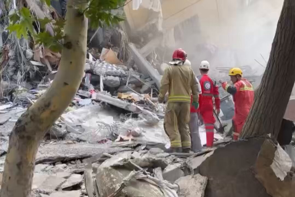 حضور تيم هاى عملیاتی و سگ های زنده یاب هلال احمر براى جستجوی مفقودین احتمالی در آوار شهرک شهید چمران تهران