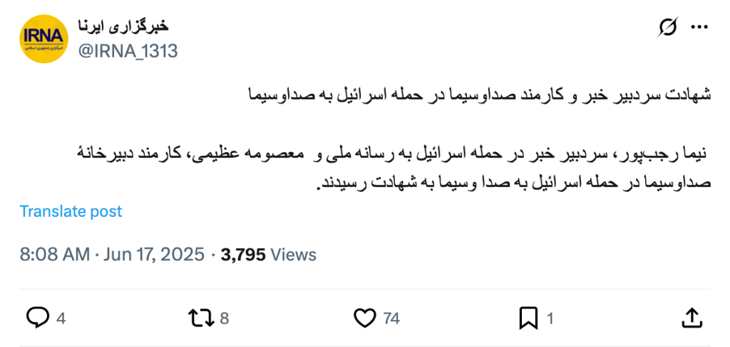 شهادت سردبیر خبر و کارمند صداوسیما در حمله اسرائیل به صداوسیما