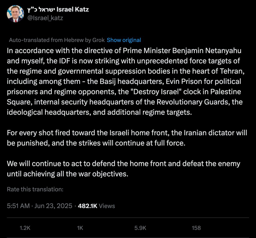 In accordance with the directive of Prime Minister Benjamin Netanyahu and myself, the IDF is now striking with unprecedented force targets of the regime and governmental suppression bodies in the heart of Tehran, including among them - the Basij headquarters, Evin Prison for political prisoners and regime opponents, the "Destroy Israel" clock in Palestine Square, internal security headquarters of the Revolutionary Guards, the ideological headquarters, and additional regime targets.