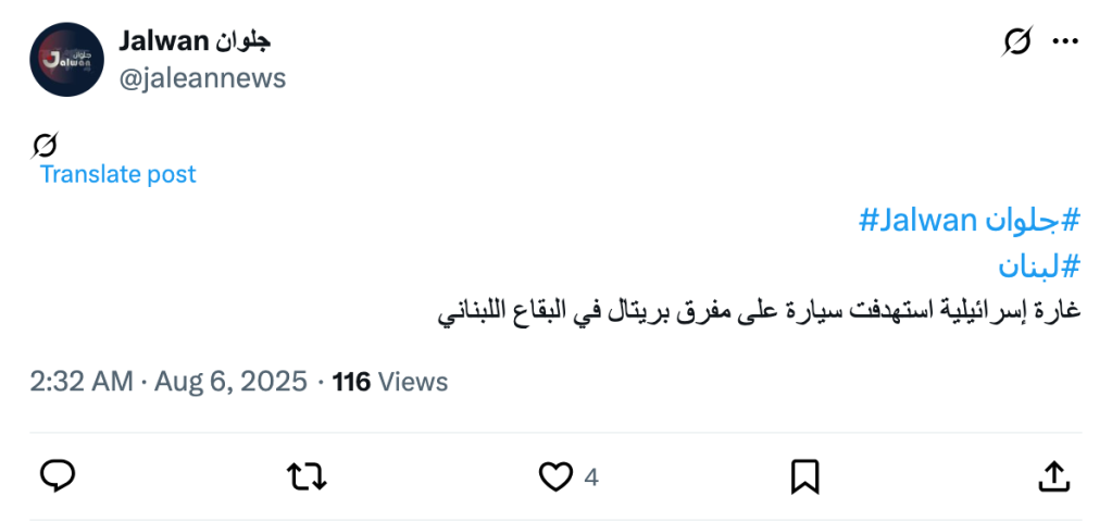 غارة إسرائيلية استهدفت سيارة على مفرق بريتال في البقاع اللبناني