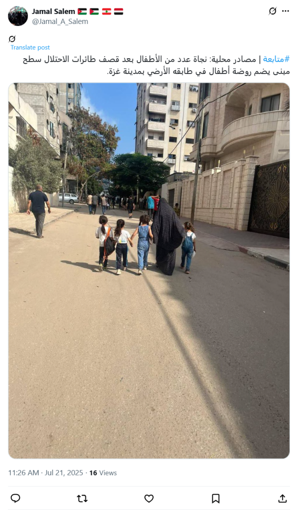#متابعة | مصادر محلية: نجاة عدد من الأطفال بعد قصف طائرات الاحتلال سطح مبنى يضم روضة أطفال في طابقه الأرضي بمدينة غزة.