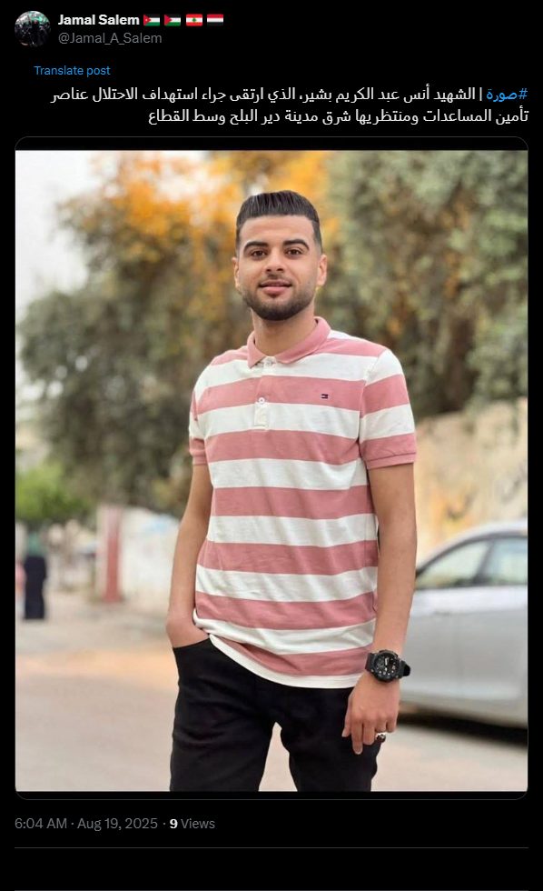 #Photo | Martyr Anas Abdel Karim Bashir, who was killed as a result of the occupation targeting aid workers and those waiting for them east of Deir al-Balah city in the central Gaza Strip.
