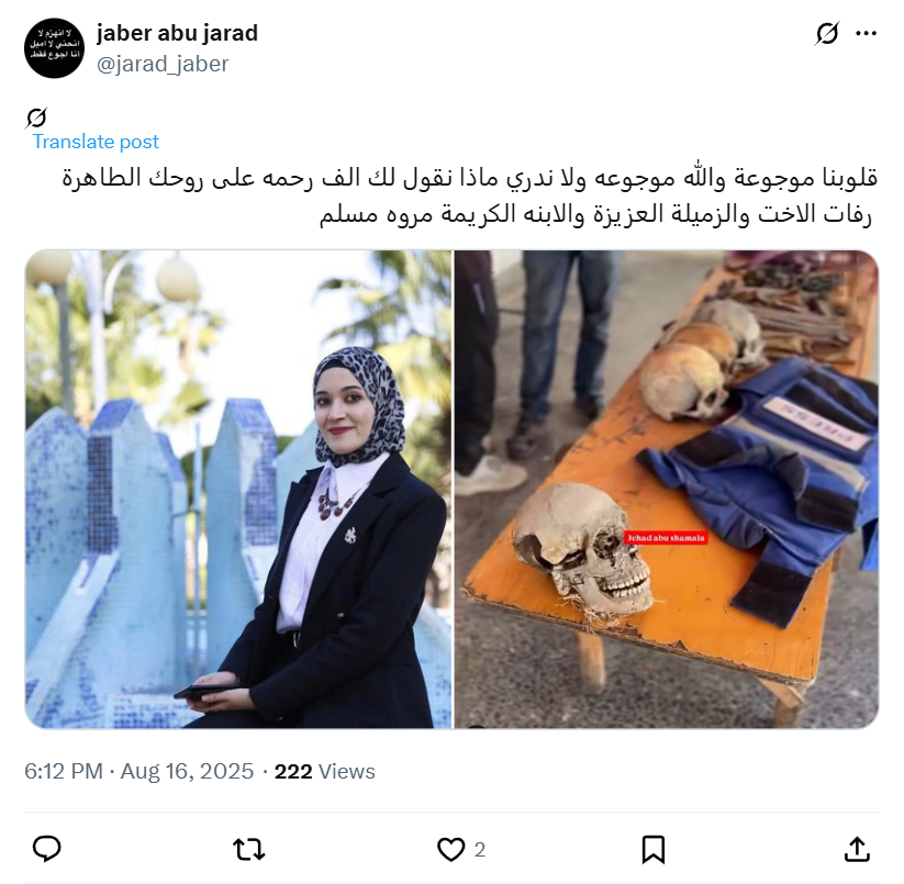 Our hearts are in pain, and we don't know what to say to you. May a thousand mercies be upon your pure soul. The remains of our dear sister, colleague, and noble daughter, Marwa Muslim.