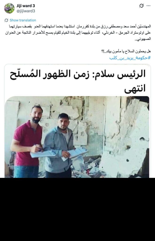 Engineers Ahmad Saad and Mustafa Rizk, from the town of Kfar Rumman, were martyred after the enemy targeted their car with a bombing on the Jarmaq-Khardali highway, while they were heading to the town of Khiam to survey the damage caused by the Zionist aggression.