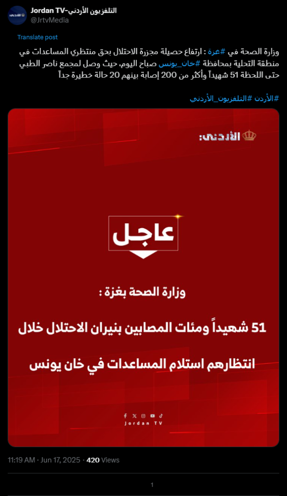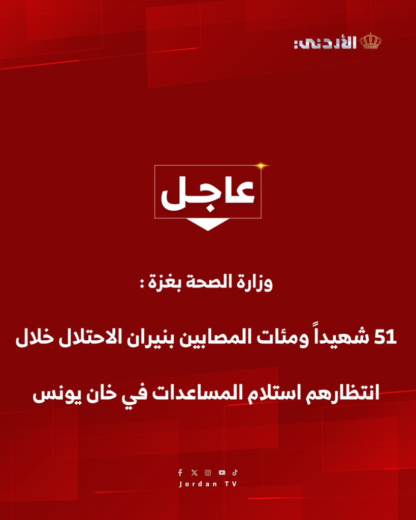 Ministry of Health in #Gaza: The death toll from the occupation's massacre of those waiting for aid in the Tahlia area in #Khan_Younis Governorate this morning has risen, as 51 martyrs and more than 200 injuries have arrived at Nasser Medical Complex so far, including 20 very serious cases. #Jordan #Jordanian_TV