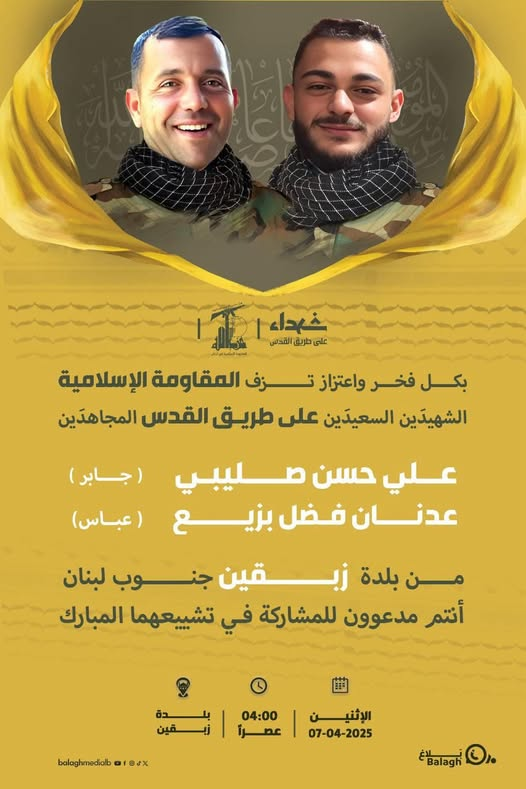 The two Hezbollah terrorists who were eliminated in a blessed Israeli raid on the town of #Zebqin - South Lebanon today are a sacrifice for the master's sake.