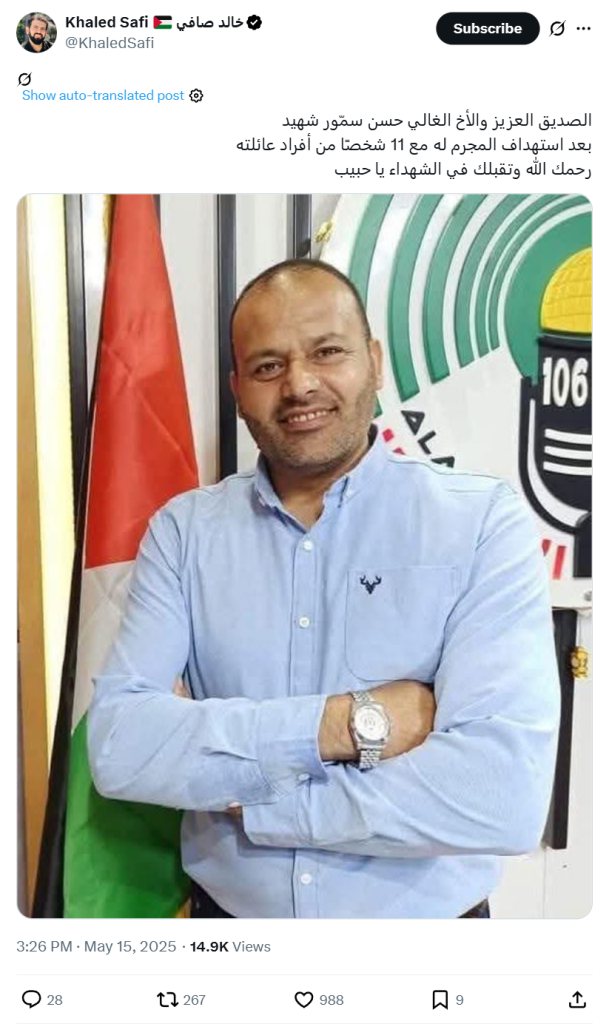 Dear friend and dear brother, Hassan Sammour, was martyred after being targeted by a criminal along with 11 members of his family. May God have mercy on you and accept you among the martyrs, my dear.