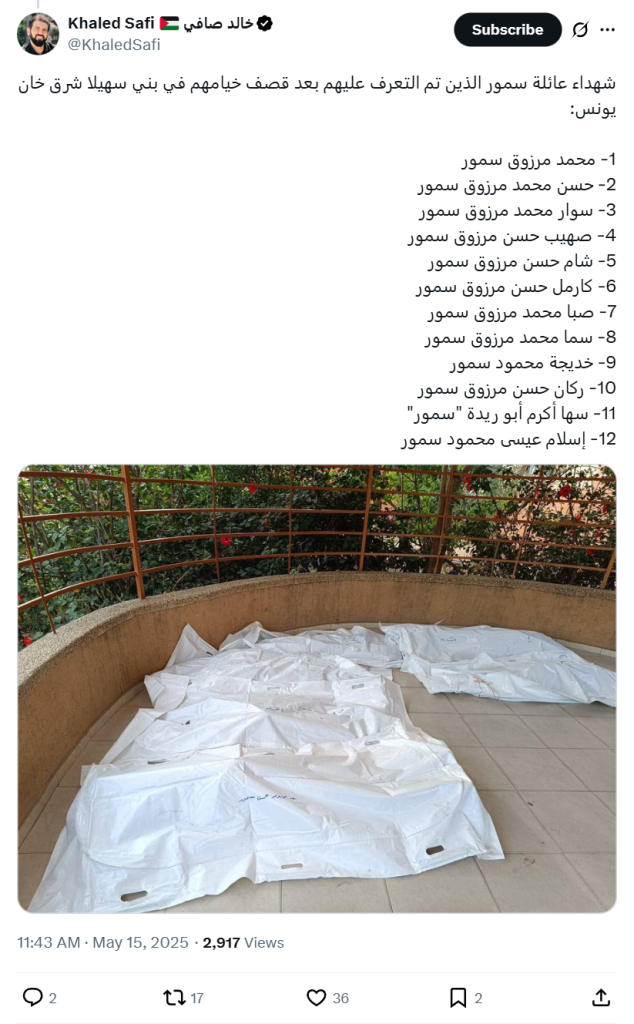 شهداء عائلة سمور الذين تم التعرف عليهم بعد قصف خيامهم في بني سهيلا شرق خان يونس: