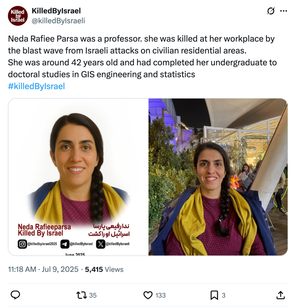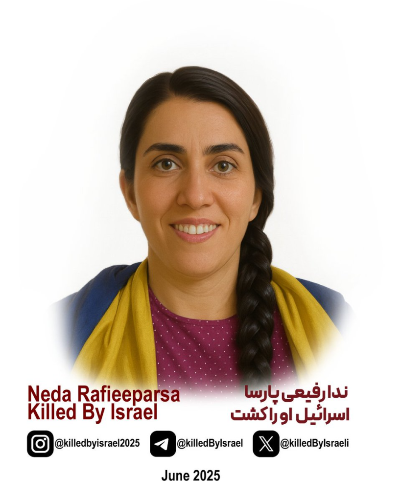 Neda Rafiee Parsa was a professor. she was killed at her workplace by the blast wave from Israeli attacks on civilian residential areas.