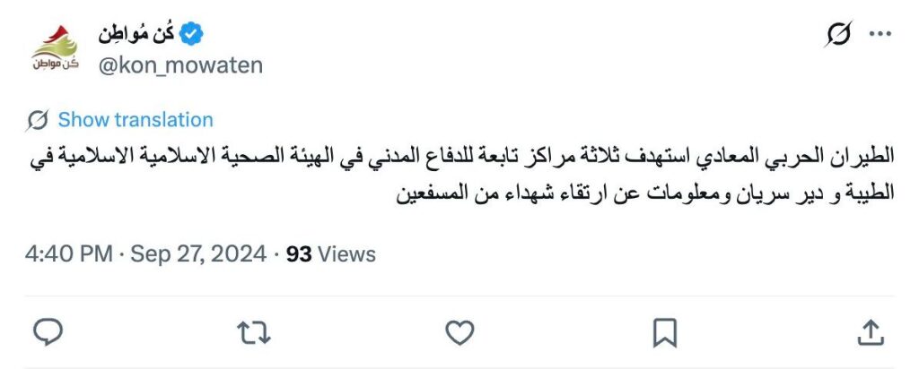 الطيران الحربي المعادي استهدف ثلاثة مراكز تابعة للدفاع المدني في الهيئة الصحية الاسلامية الاسلامية في الطيبة و دير سريان ومعلومات عن ارتقاء شهداء من المسفعين