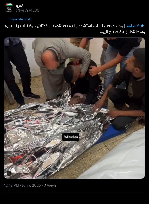 #شاهد | وداع صعب لشاب استشهد والده بعد قصف الاحتلال مركبة لبلدية البريج وسط قطاع غزة صباح اليوم