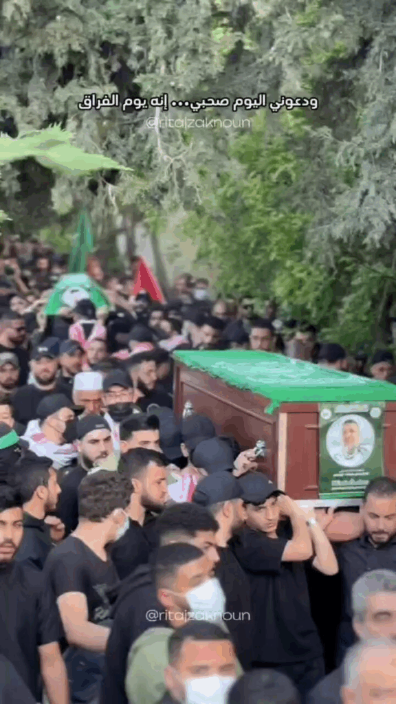 The funeral of the martyred Qassam commander Hassan Ahmed Farhat, along with his martyred daughter Janan and his martyred son Hamza, took place at dawn today in Sidon, southern Lebanon. #Lebanon #Sidon #South_Lebanon #Southern_Suburb