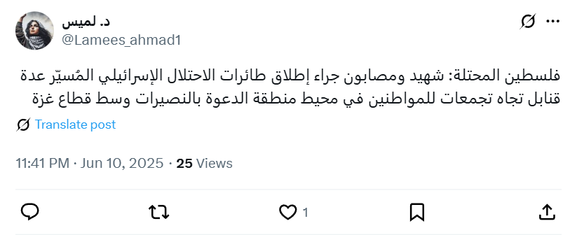 Archive URL: https://airwars.org/source/x-com-lamees_ahmad1-1932538558276870210-2025-06-10-204111/