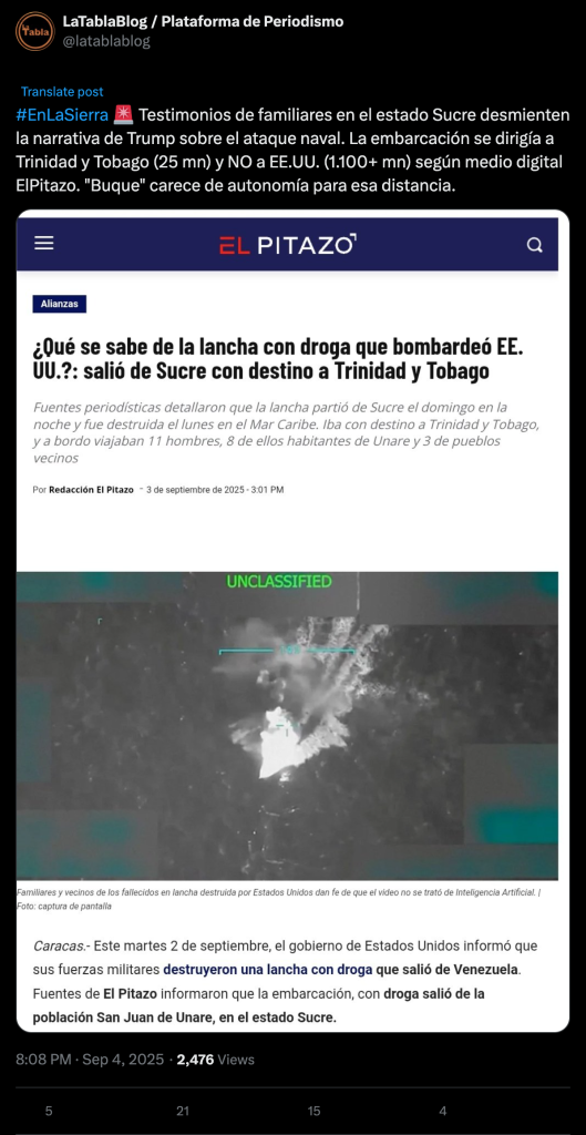 #EnLaSierra Testimonios de familiares en el estado Sucre desmienten la narrativa de Trump sobre el ataque naval. La embarcación se dirigía a Trinidad y Tobago (25 mn) y NO a EE.UU. (1.100+ mn) según medio digital ElPitazo. "Buque" carece de autonomía para esa distancia.