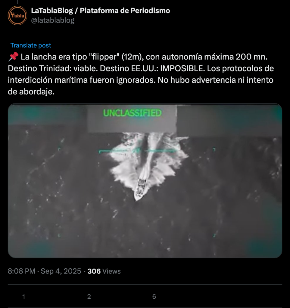 La lancha era tipo "flipper" (12m), con autonomía máxima 200 mn. Destino Trinidad: viable. Destino EE.UU.: IMPOSIBLE. Los protocolos de interdicción marítima fueron ignorados. No hubo advertencia ni intento de abordaje.
