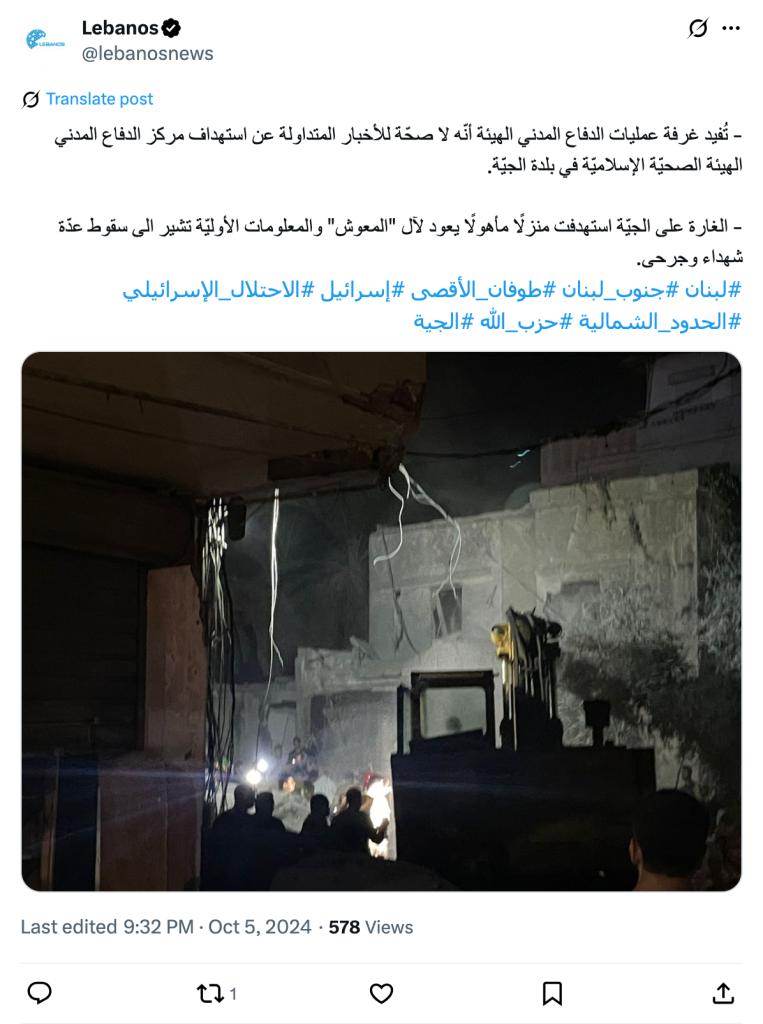 - The Civil Defense Operations Room of the Authority informs that the news circulating about targeting the Civil Defense Center of the Islamic Health Authority in the town of Jiyeh is untrue. - The raid on Jiyeh targeted an inhabited house belonging to the "Al-Maoush" family, and initial information indicates the fall of several martyrs and wounded. #Lebanon #South_Lebanon #Al-Aqsa_Flood #Israel #Israeli_Occupation #Northern_Border #Hezbollah #Jiyeh
