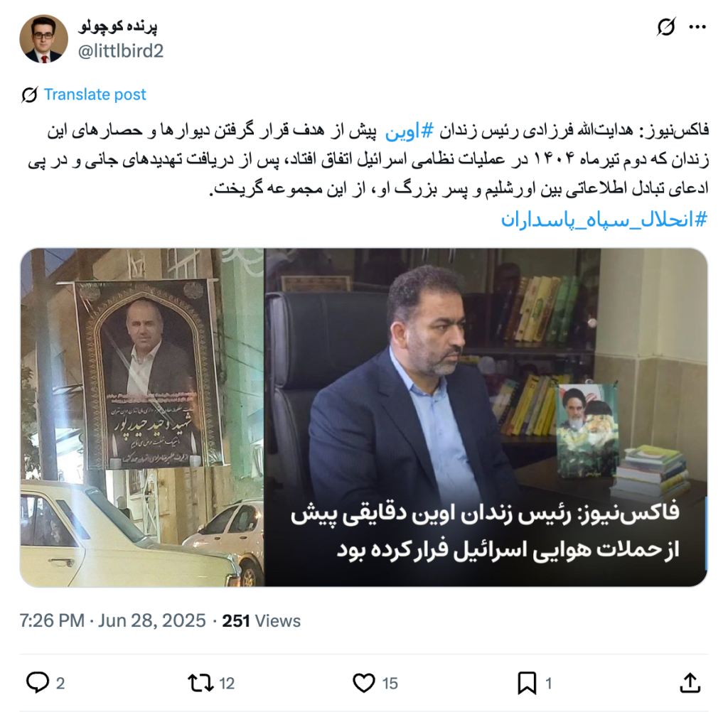 Fox News: Hedayatollah Farzadi, the head of #Evin prison, fled the complex before the prison's walls and fences were targeted in an Israeli military operation on July 2, 1404, after receiving death threats and following allegations of information exchange between Jerusalem and his eldest son. #Dissolution_of_the_IRGC