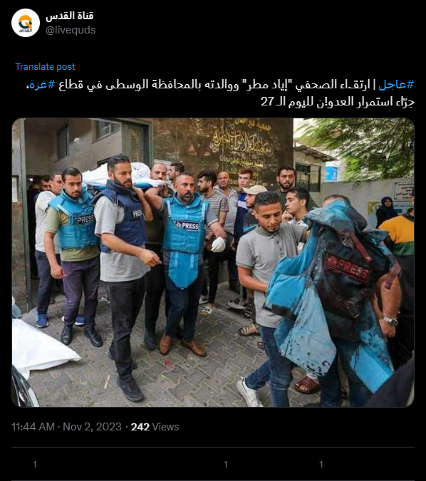 #عاجل | ارتقـ.اء الصحفي "إياد مطر" ووالدته بالمحافظة الوسطى في قطاع #غزة، جرّاء استمرار العدو!ن لليوم الـ 27