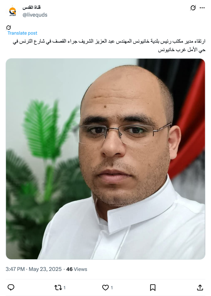 The director of the office of the mayor of Khan Yunis, Engineer Abdul Aziz Al-Sharif, was killed as a result of the shelling on Al-Tarnis Street in Al-Amal neighborhood, west of Khan Yunis.