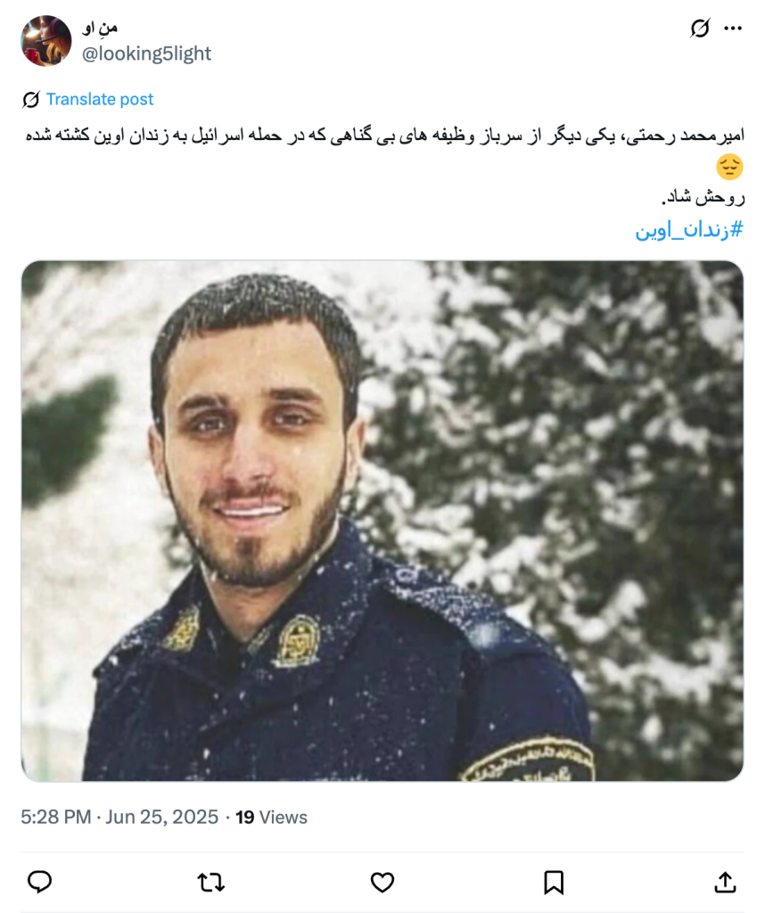 May Amir Mohammad Rahmati, another innocent conscript who was killed in the Israeli attack on Evin Prison, rest in peace. #Evin_Prison