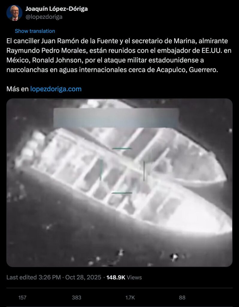 Foreign Minister Juan Ramón de la Fuente and Navy Secretary Admiral Raymundo Pedro Morales are meeting with U.S. Ambassador to Mexico Ronald Johnson regarding the U.S. military attack on drug-trafficking boats in international waters near Acapulco, Guerrero.