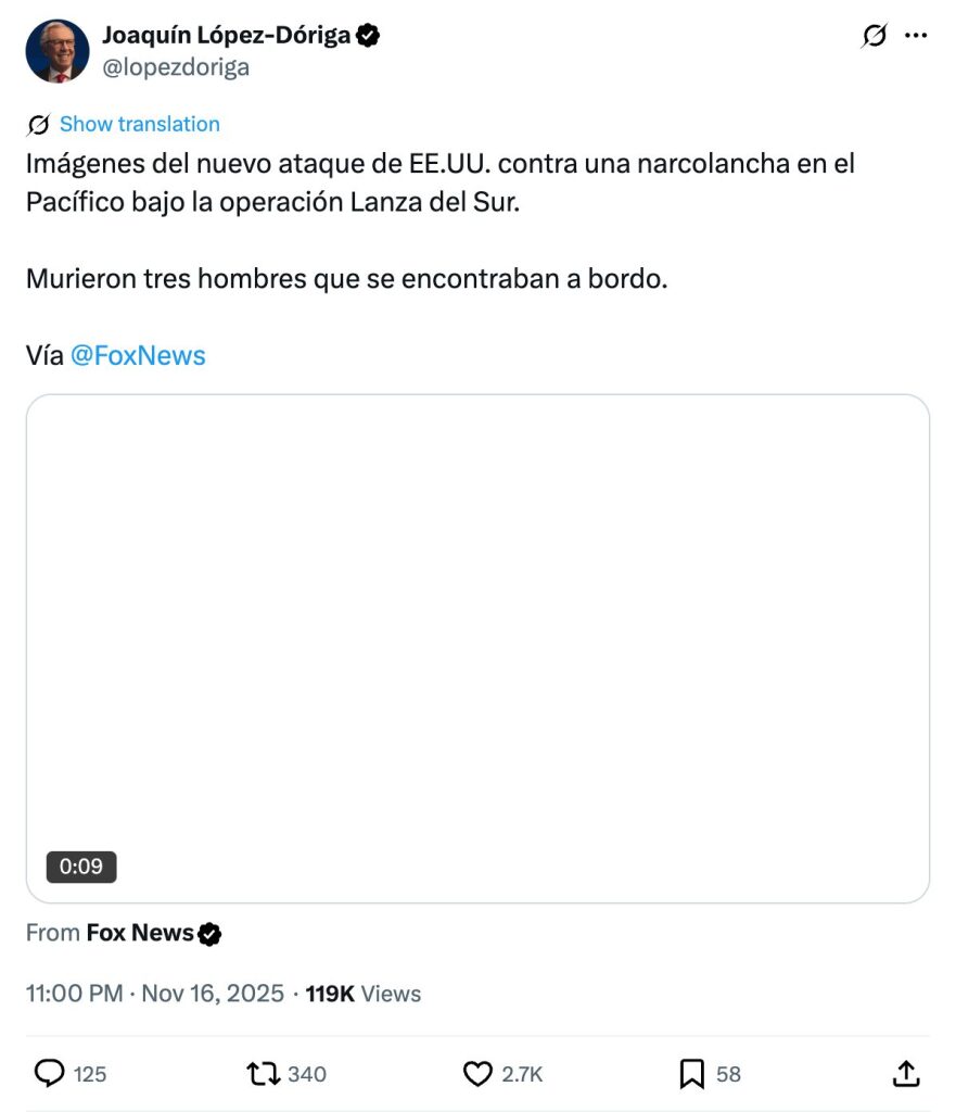 Imágenes del nuevo ataque de EE.UU. contra una narcolancha en el Pacífico bajo la operación Lanza del Sur.