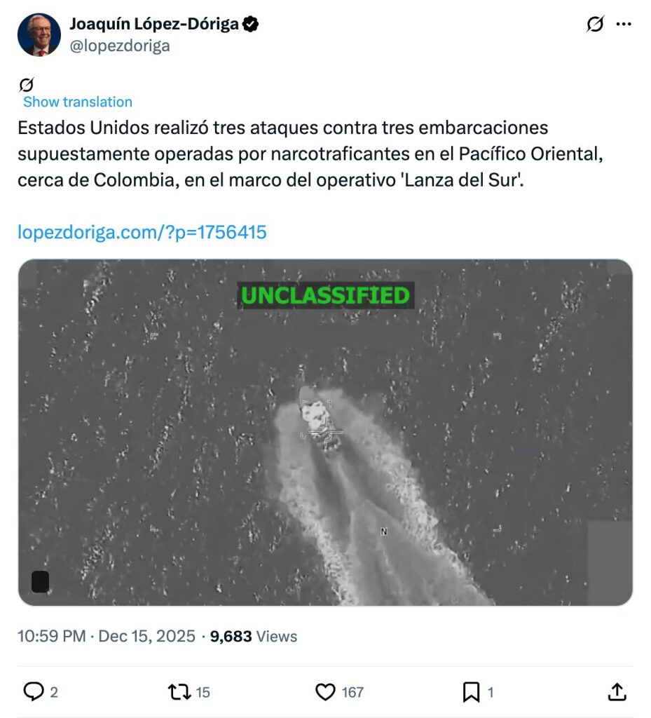 The United States carried out three attacks against three vessels allegedly operated by drug traffickers in the Eastern Pacific, near Colombia, as part of Operation Southern Spear.