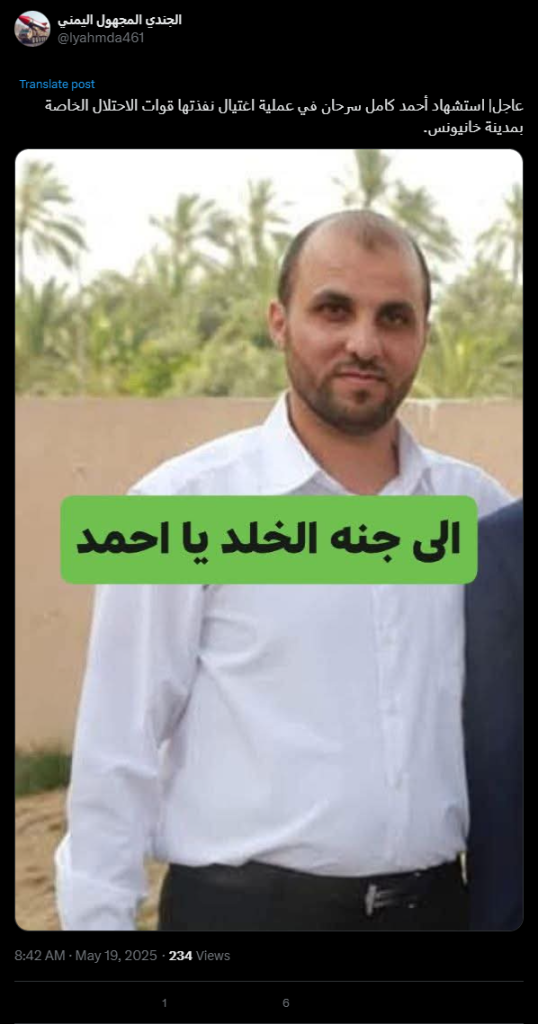 Urgent | Ahmed Kamel Sarhan was assassinated by Israeli special forces in Khan Yunis.