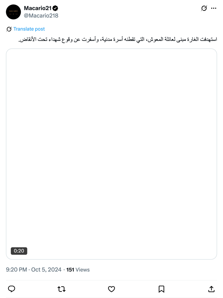 استهدفت الغارة مبنى لعائلة المعوش، التي تقطنه أسرة مدنية، وأسفرت عن وقوع شهداء تحت الأنقاض.