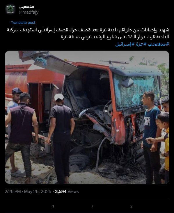 A martyr and injuries among Gaza Municipality crews after an Israeli bombardment targeted a municipal vehicle near Roundabout 17 on Rashid Street, west of Gaza City. #Artilleryman #Gaza #Israel