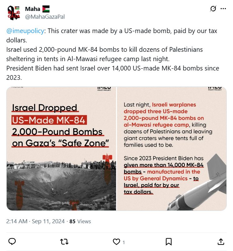 Israel used 2,000-pound MK-84 bombs to kill dozens of Palestinians sheltering in tents in Al-Mawasi refugee camp last night.