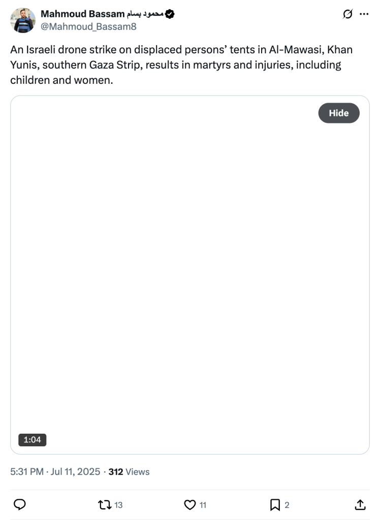 An Israeli drone strike on displaced persons’ tents in Al-Mawasi, Khan Yunis, southern Gaza Strip, results in martyrs and injuries, including children and women.