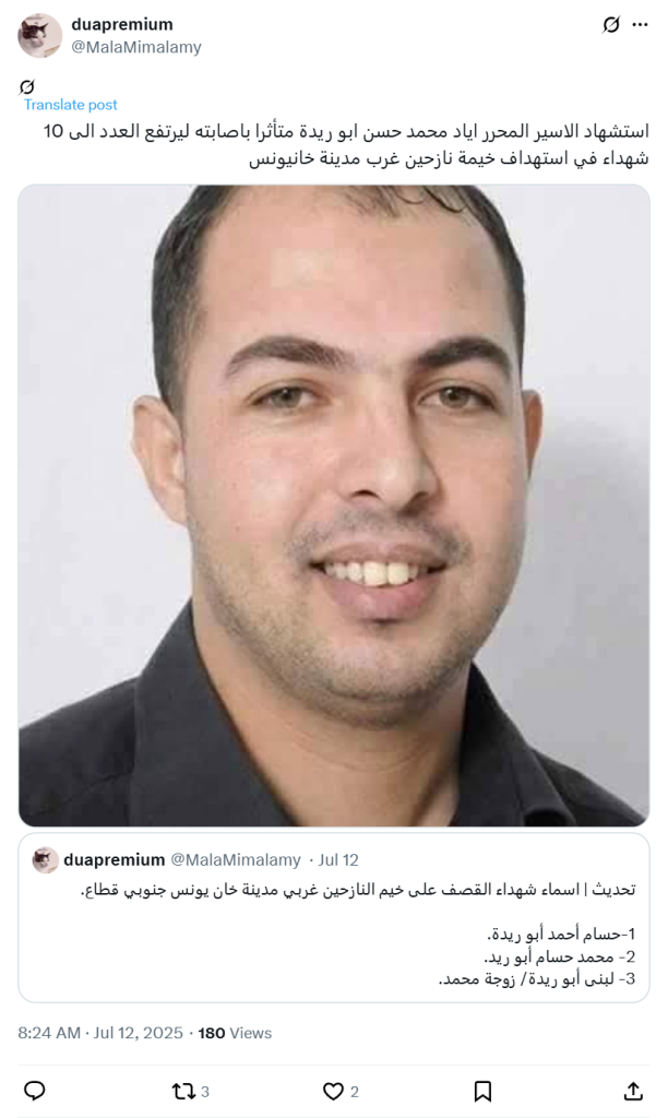 The martyrdom of the freed prisoner, Iyad Muhammad Hassan Abu Rida, from his wounds, bringing the number of martyrs to 10, in the targeting of a displaced persons' tent west of Khan Yunis.