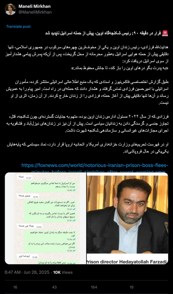Escape in the 90th Minute: Evin Prison Chief Disappears Before Israeli Attack Hedayatollah Farzadi, the head of Evin Prison and one of the most feared figures in the Islamic Republic’s repression, secretly fled the prison just minutes before an Israeli airstrike, after his son received a warning message from Israel: “Tell your father to open the doors of Evin, so that his life is safe.” According to an exclusive report by Fox News and documents released by an Israeli intelligence source, Israeli agents contacted Amir Hossein Farzadi and warned him that an attack was coming. Amir passed the message on to his uncle, who took Farzadi out of the prison just minutes before the attack began. He has not been seen since. Farzadi, who has been in charge of Evin Prison since 2022, is accused of widespread crimes including torture, murder, sexual assault, and starvation of political prisoners. He was previously known for administering inhumane punishments and organizing torture in the prisons of Dizel Abad and Fashafoyeh. He is on the sanctions list of the US Treasury Department and the European Union, a symbol of a system whose foundations are crumbling one by one. https://foxnews.com/world/notorious-iranian-prison-boss-flees-minutes-before-israeli-airstrikes-after-secret-warning.amp…