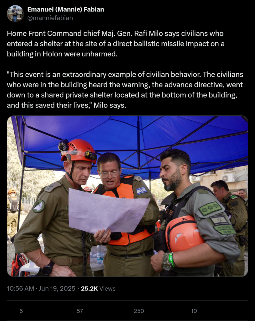 Home Front Command chief Maj. Gen. Rafi Milo says civilians who entered a shelter at the site of a direct ballistic missile impact on a building in Holon were unharmed.