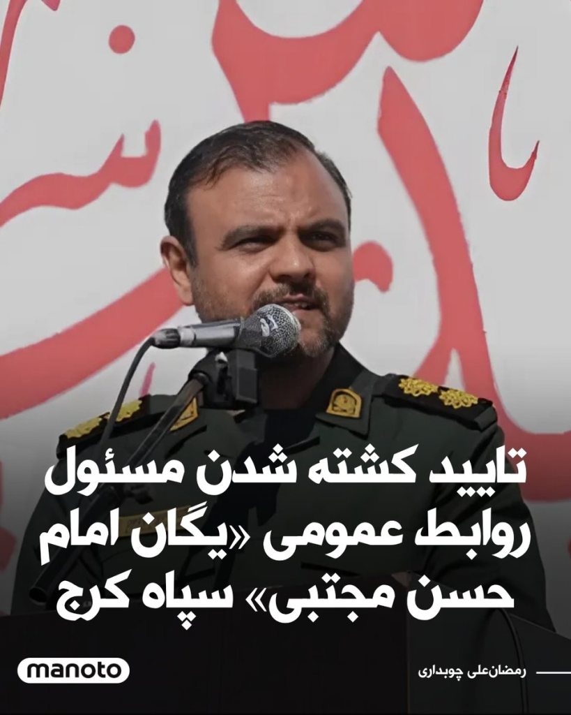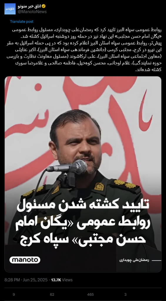 The Alborz IRGC Public Relations confirmed that Ramzan Ali Chobdari, the public relations officer for the organization’s “Imam Hassan Mojtaba Unit,” was also killed in Monday’s Israeli attack. Earlier, the Alborz IRGC Public Relations announced that Mojtaba Karami (Deputy Commander of the Alborz Provincial IRGC), Akbar Enayati (Deputy Social Officer of the Alborz Provincial IRGC), Ali Tarkashvand (Head of the Deputy for Supervision and Inspection of the Representative Area), Gholam Ojani, Mohsen Kohkhel, Fatemeh Salehi, and Gholam Reza Souri were killed following the Israeli attack on the force’s headquarters in Karaj.