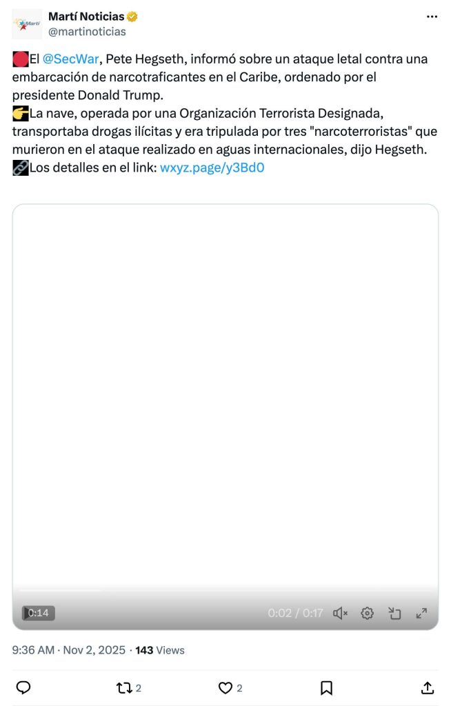 El @SecWar, Pete Hegseth, informó sobre un ataque letal contra una embarcación de narcotraficantes en el Caribe, ordenado por el presidente Donald Trump.