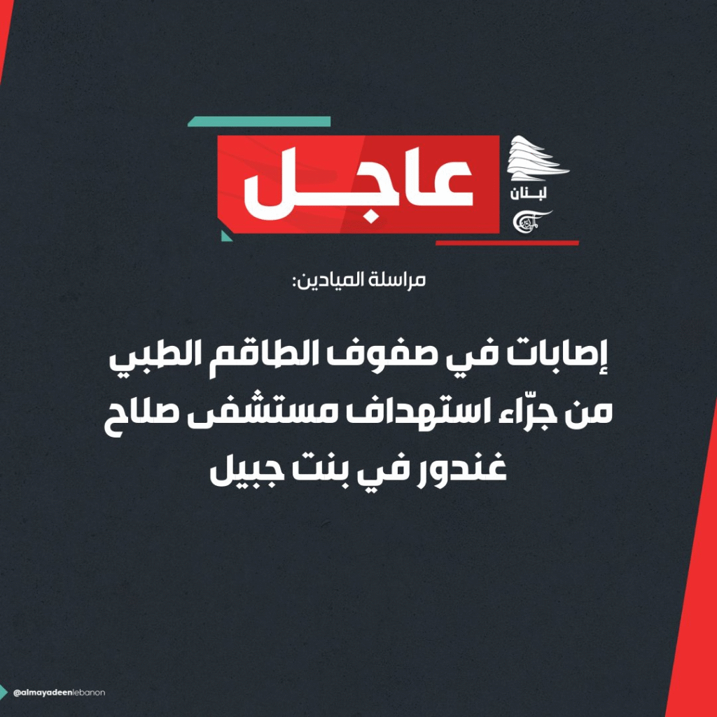 Al-Mayadeen correspondent in the south: The Israeli occupation targeted Salah Ghandour Hospital in the city of Bint Jbeil with several artillery shells, resulting in injuries among the medical staff. #AlMayadeen_Lebanon