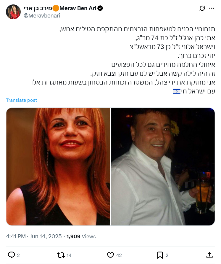 My sincere condolences to the families of those murdered in last night's missile attack, Eti Cohen Angel, 74, of Rehovot, and Yisrael Aloni, 73, of Rishon LeZion. May their memory be blessed. Best wishes for a speedy recovery to all the wounded. It was a difficult night, but we have a strong people and a strong army. I strengthen the hands of the IDF, the police, and the security forces in these challenging hours. With Israel alive.